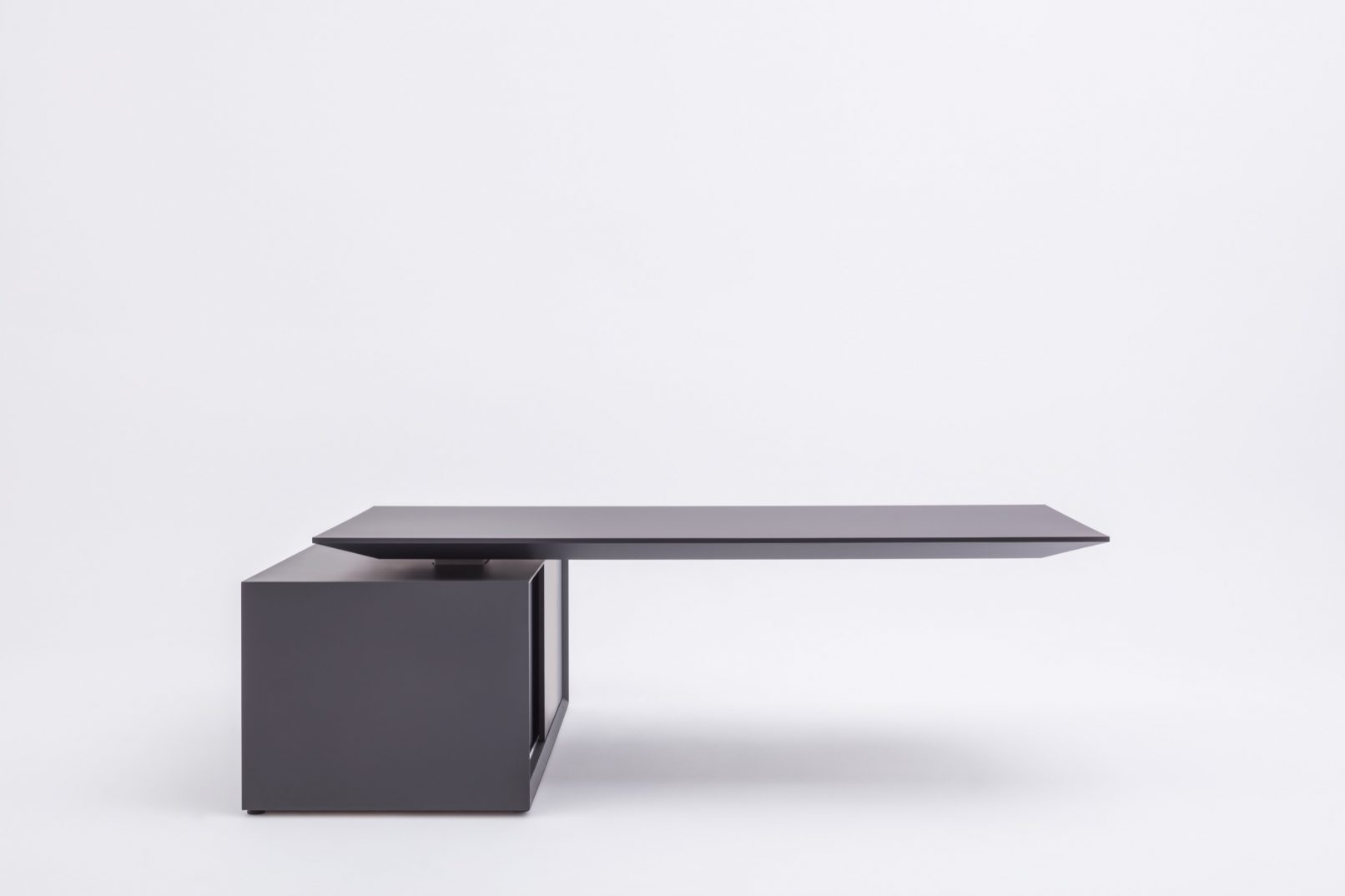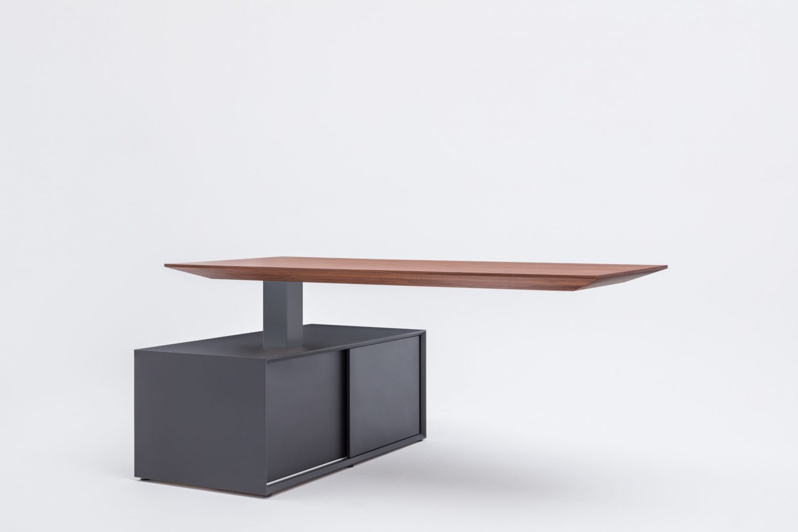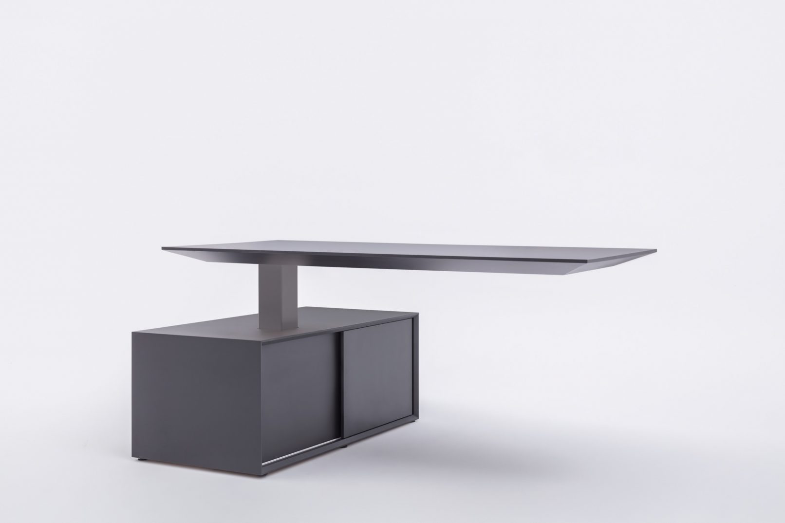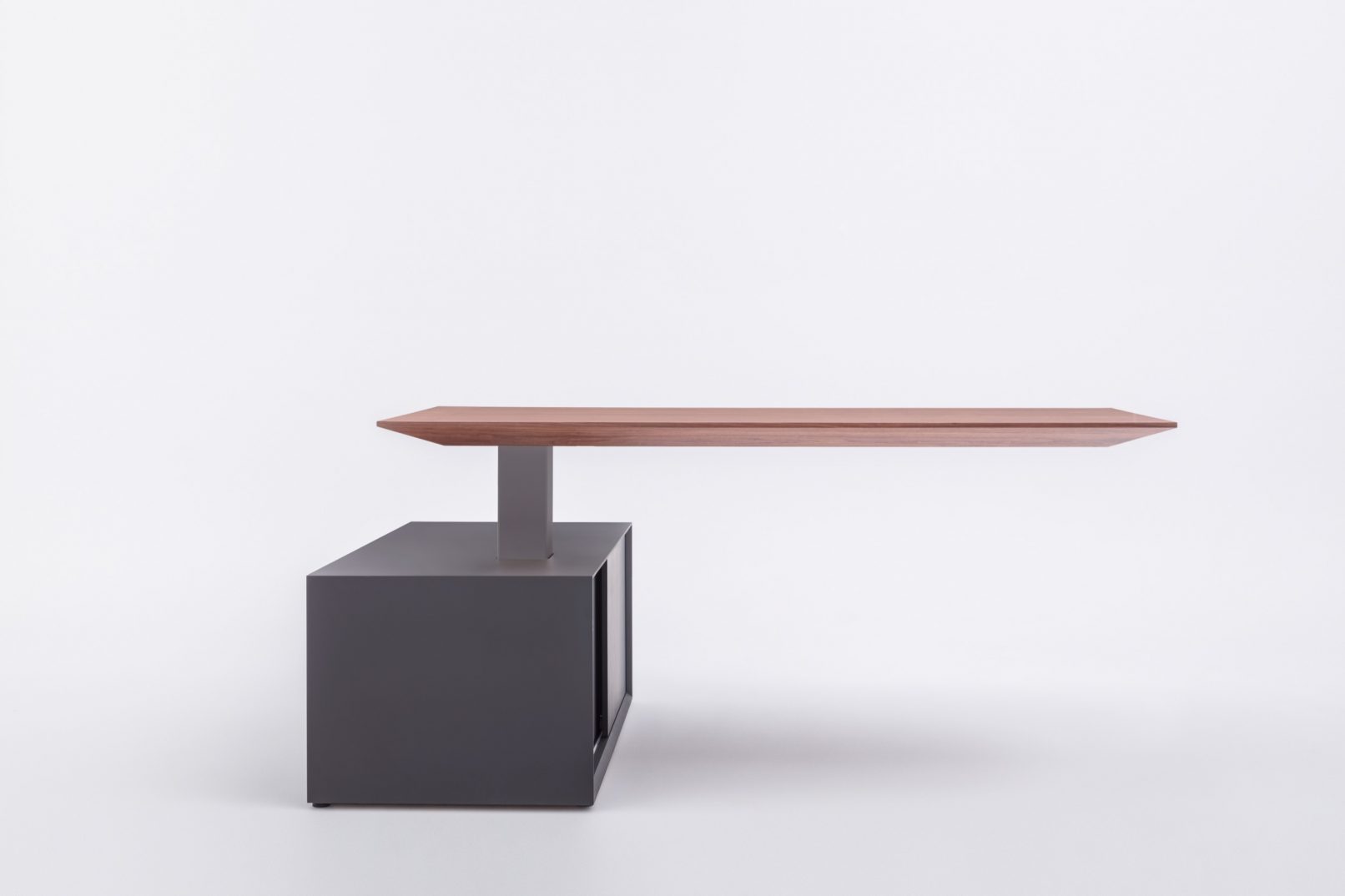 Na przekór grawitacji, a przy tym stabilnie i komfortowo! Gravity przenosi ideę biurka menadżerskiego na zupełnie nowy poziom. Minimalistyczna forma, inspirowana modernistyczną architekturą, zintegrowana została z technologią. Duży, osadzony na jednym punkcie podparcia blat i niewidoczna konstrukcja nośna przywodzi na myśl lewitującą powierzchnię. Regulowana elektrycznie wysokość blatu umożliwia ergonomiczną pracę i płynną zmianę pozycji z siedzącej na stojącą. W pełnej kolekcji, prócz biurka Gravity, znajdują się: stół konferencyjny z regulacją wysokości, stolik do kawy, regał i modułowy system przechowywania. To oryginalne biurko stanowi odważną propozycję adresowaną do nowoczesnych liderów.