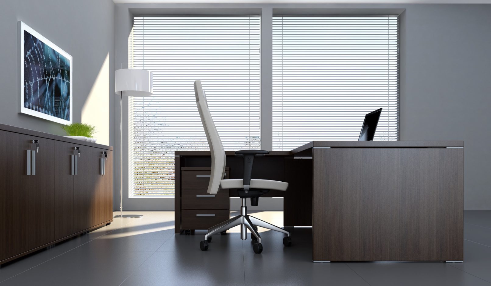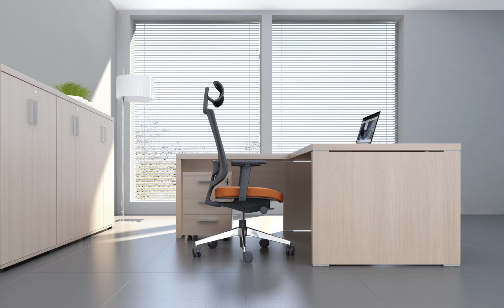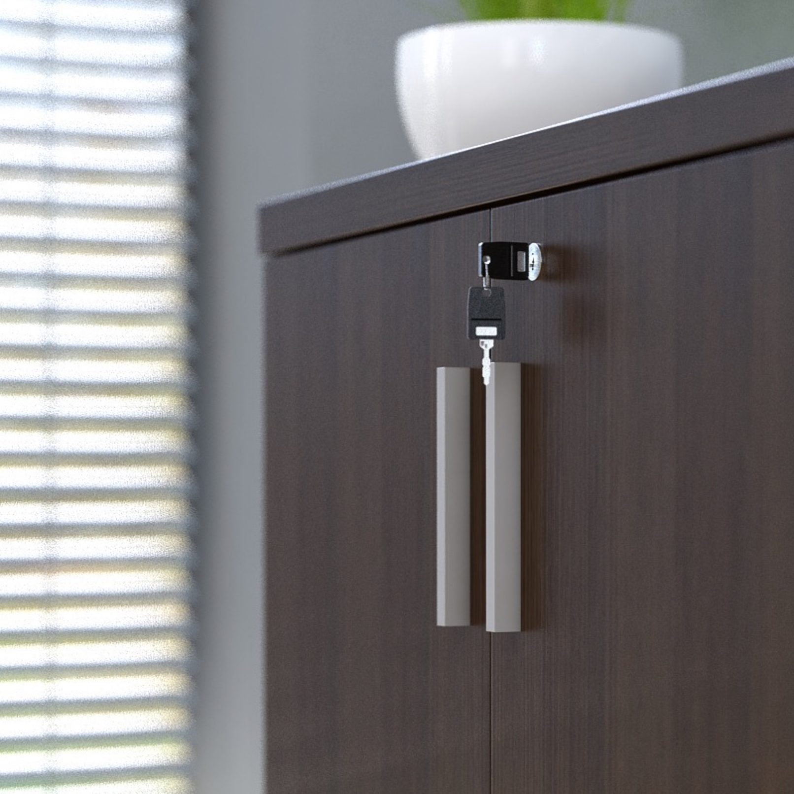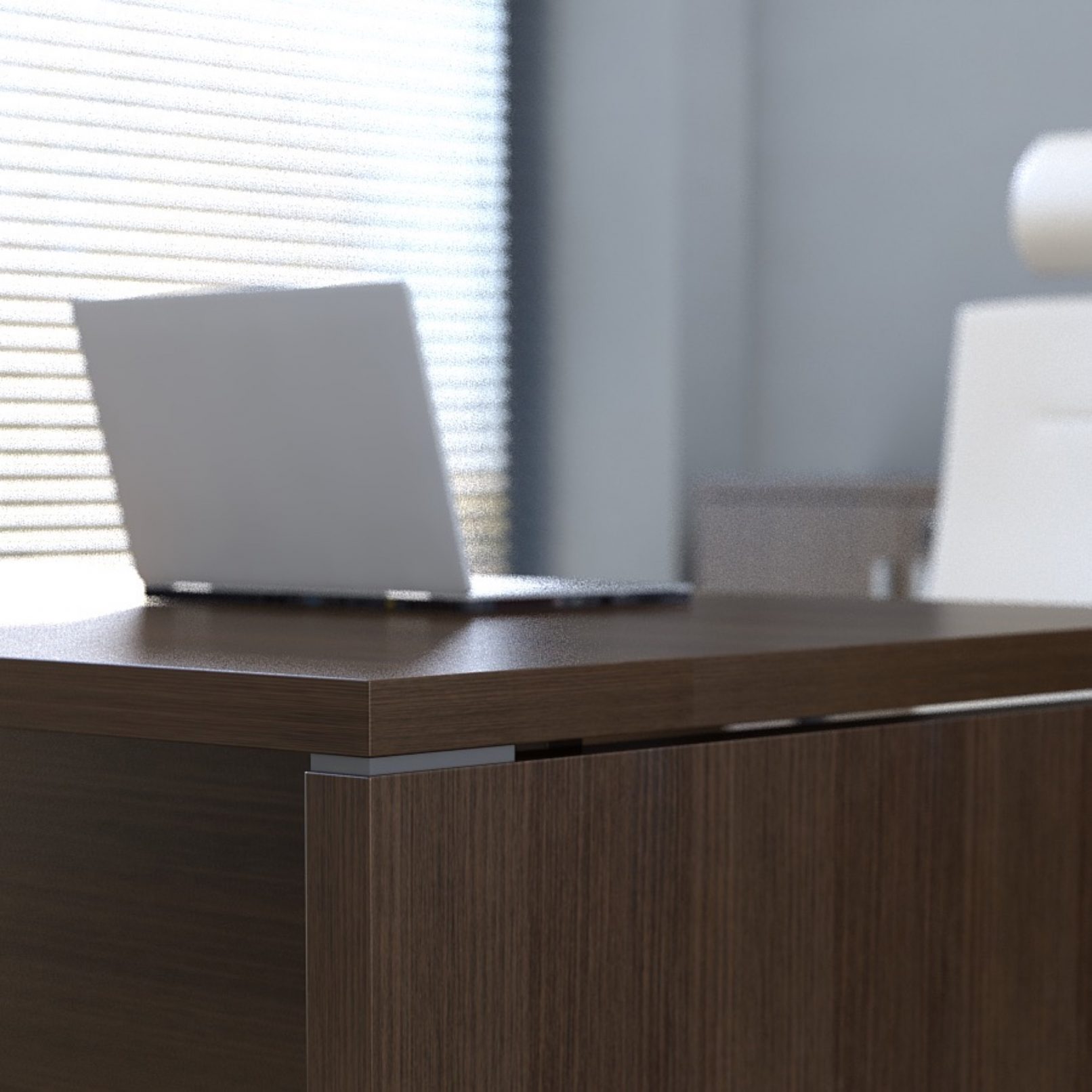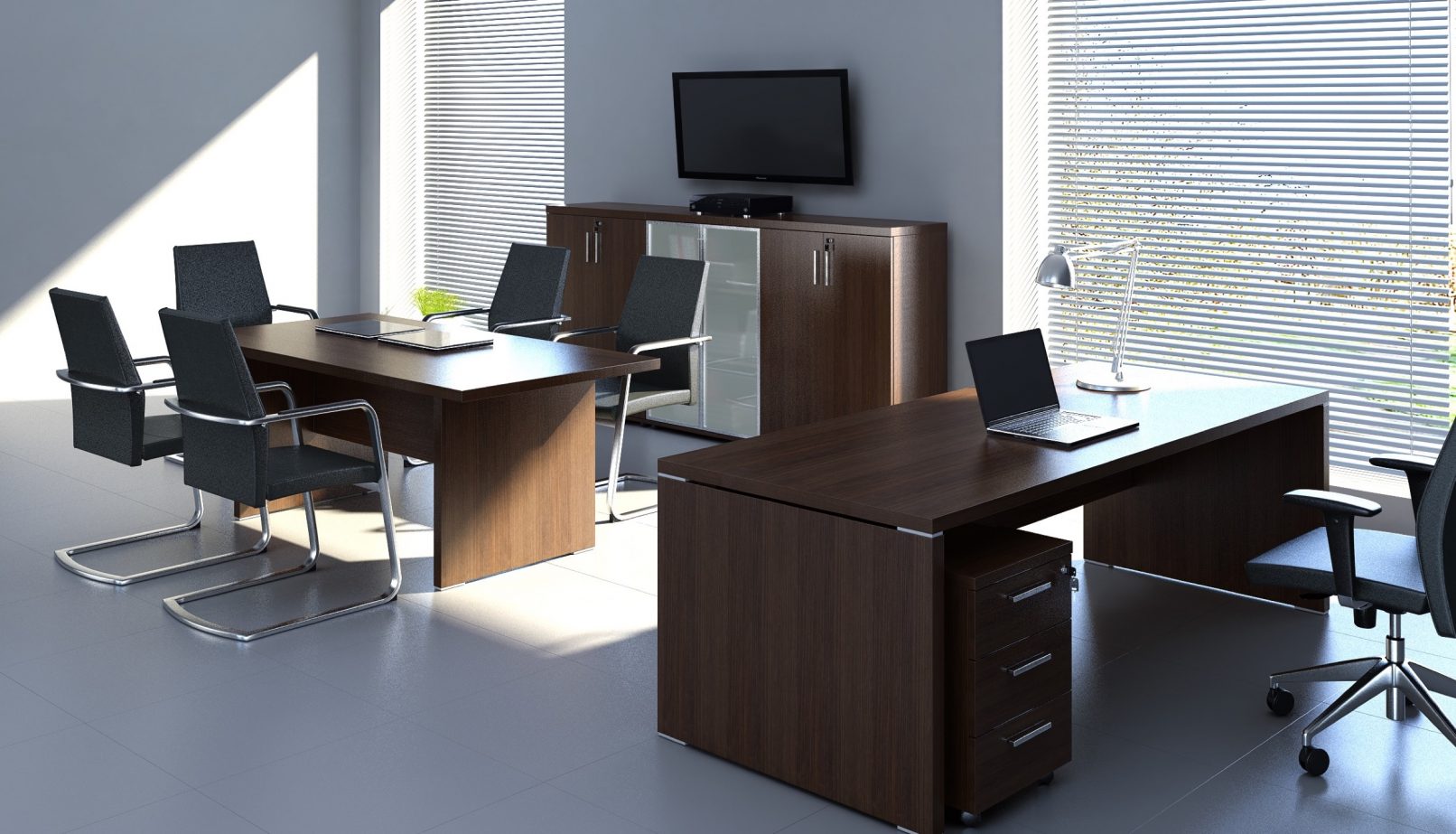 Prosta linia mebli ozdobiona jest dekoracyjnym, aluminiowym detalem. Te minimalistyczne meble gabinetowe znakomicie pasują do nowoczesnych wnętrz. Dzięki ponadczasowemu wzornictwu interpretują elegancję na nowo, a precyzja wykonania zapewnia komfort pracy. Całość funkcjonalnie uzupełnia szafka menadżerska, ułatwiająca utrzymanie porządku na stanowisku. Stoły i szafy umożliwiają całościowe wyposażenie gabinetu.